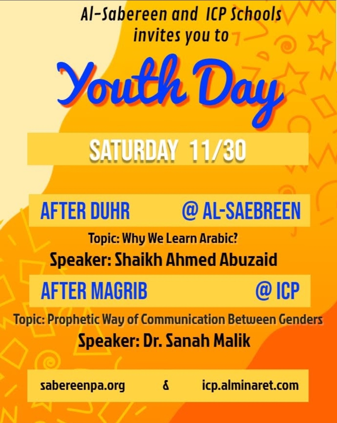 Dr. Sanah Malik (Dr. Saleh Malik and Sr. Samia Malik's daughter) will be hosting an useful lecture on the Prophetic way of communicating between genders after Maghrib Salah today (Nov 30). This is a useful topic specifically for teens and kids at school, adults who has to communicate between genders at work etc. Bring your kids and get benefitted from this useful lecture, In shā Allāh.